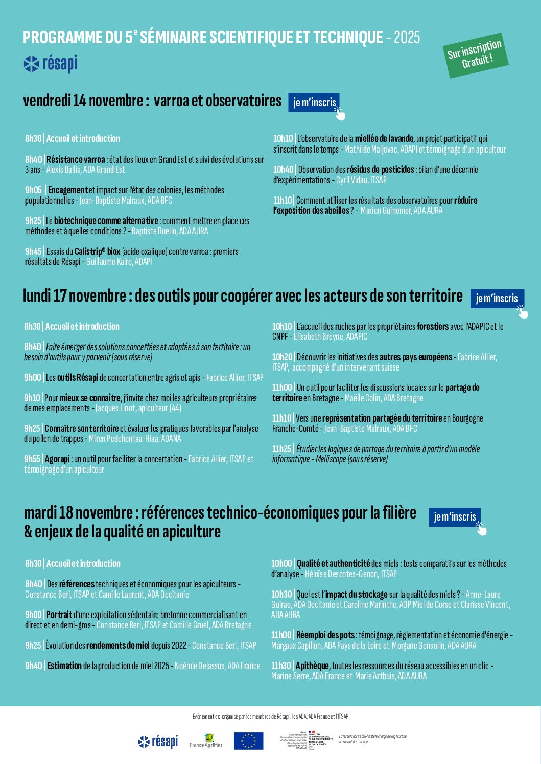 Le 5ᵉ séminaire scientifique et technique de Résapi réunira techniciens du réseau, apiculteurs et partenaires sur trois matinées pour échanger, partager et avancer ensemble sur les grands enjeux de la filière apicole !