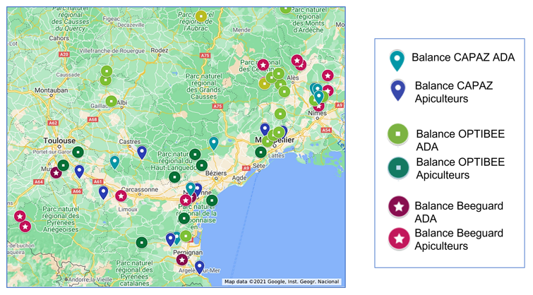 En 2021, les 31 balances de l’ADA Occitanie (10 CAPAZ, 15 OPTIBEE et 6 BEEGUARD) ont été distribuées à des apiculteurs pour les accompagner dans leur saison apicole. Treize apiculteurs sont localisés en Midi-Pyrénées, dix-huit en Languedoc-Roussillon. Le rôle de l’ADA Occitanie est de les accompagner dans la prise en main technique des balances et dans l’utilisation des différents sites internet. Aussi, elle veille au bon respect des règles d’utilisation du réseau (notamment les mises à jour régulières des miellées et des communes).